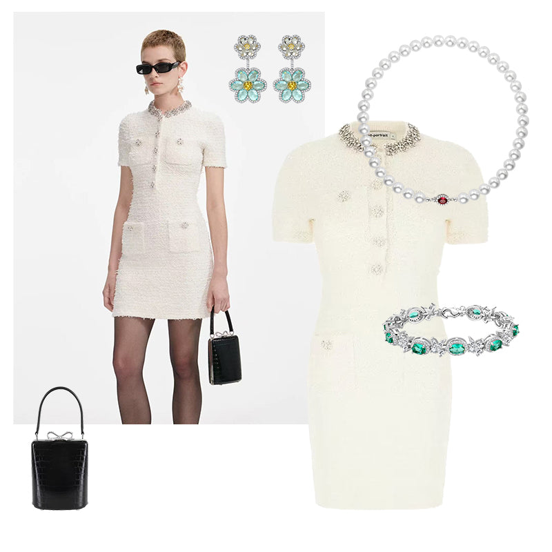 Each piece whispers refinement: The floral earrings bring a fresh sparkle, the pearl necklace lends quiet confidence, and the emerald bracelet adds a touch of festive green.