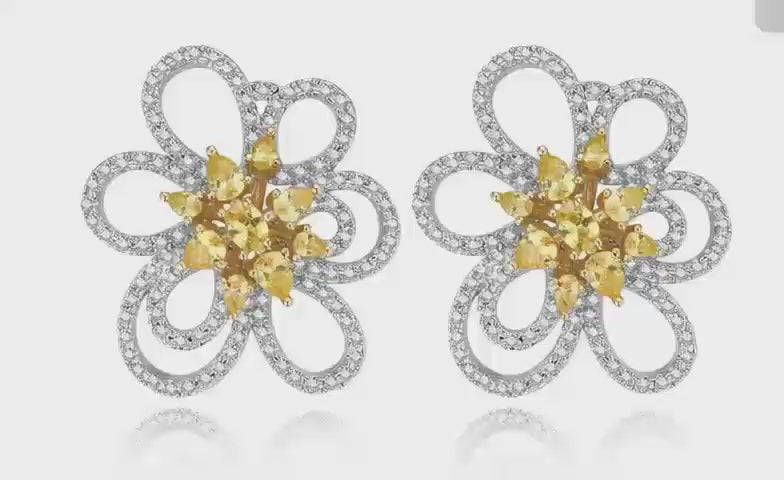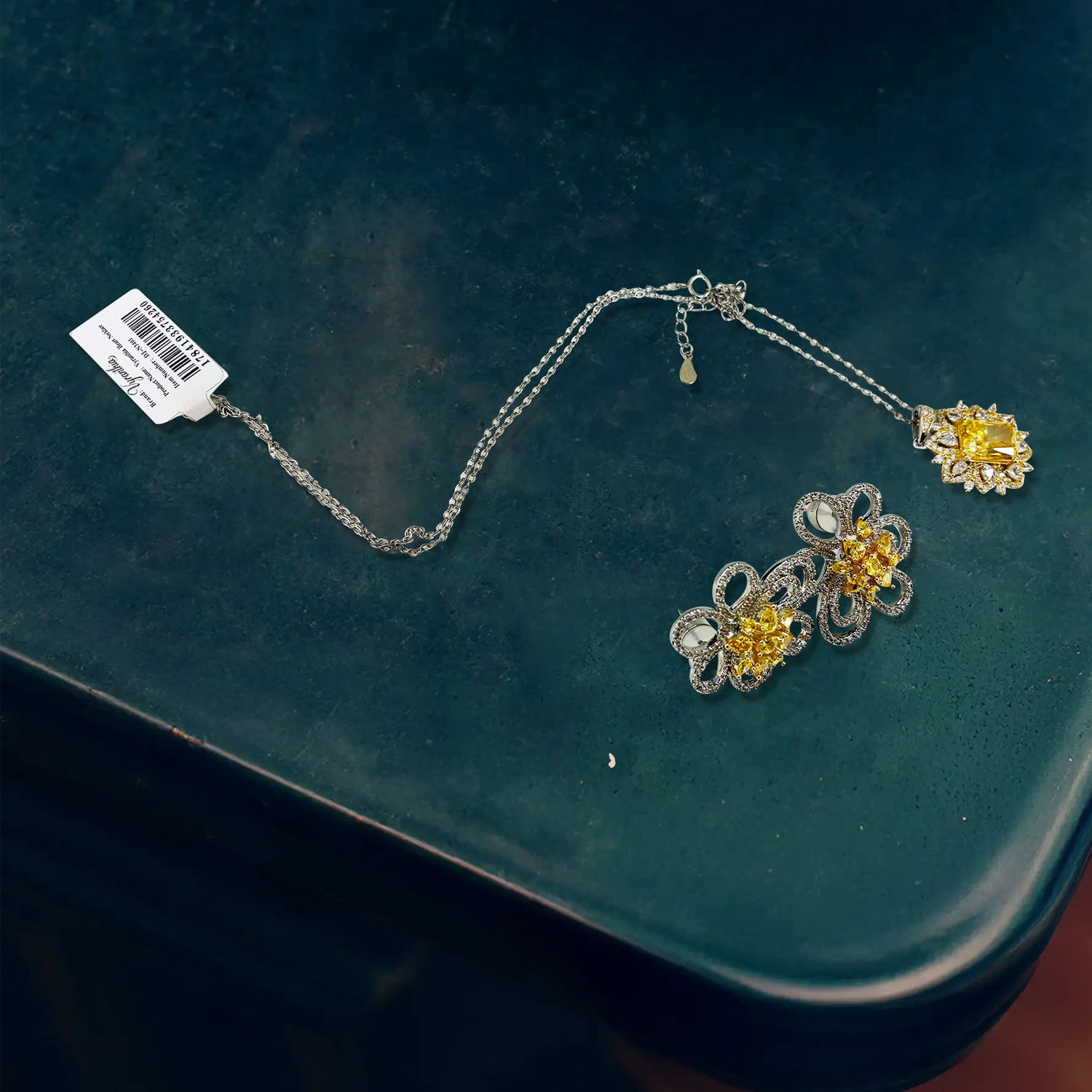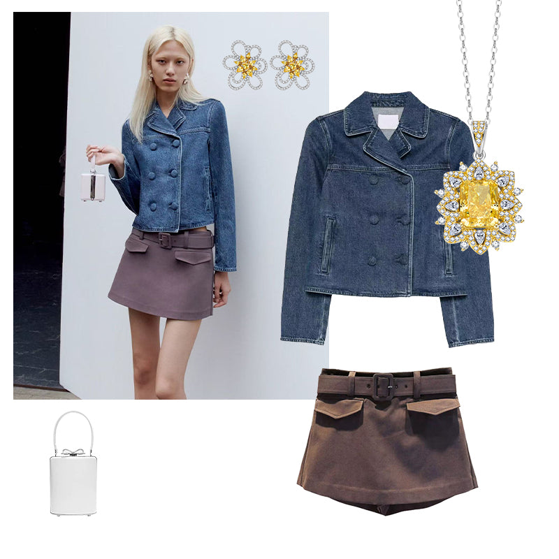 The delicate flower-shaped earrings and the vibrant yellow gemstone pendant bring warmth to the cool tones of denim and mocha.