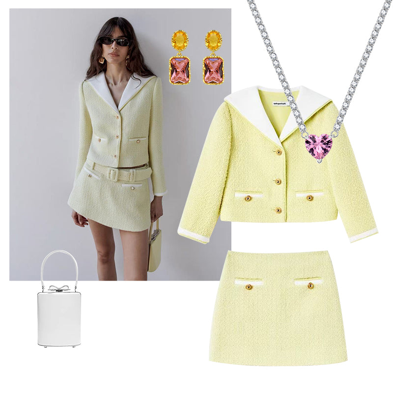 Soft as morning sunlight, this pastel ensemble captures effortless charm and confidence. Paired with pink and yellow gemstones, the look radiates warmth — a perfect blend of sweetness and sophistication.