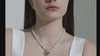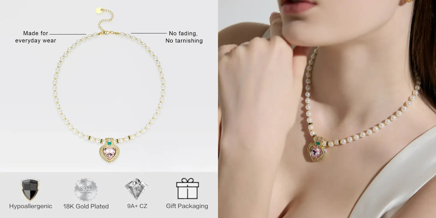 This elegant necklace features a strand of delicate white beads accented with gold-tone spacers, creating a timeless and romantic design. The centerpiece is a stunning heart-shaped pink crystal framed by sparkling clear stones, with a hint of green detail at the top for a unique touch.