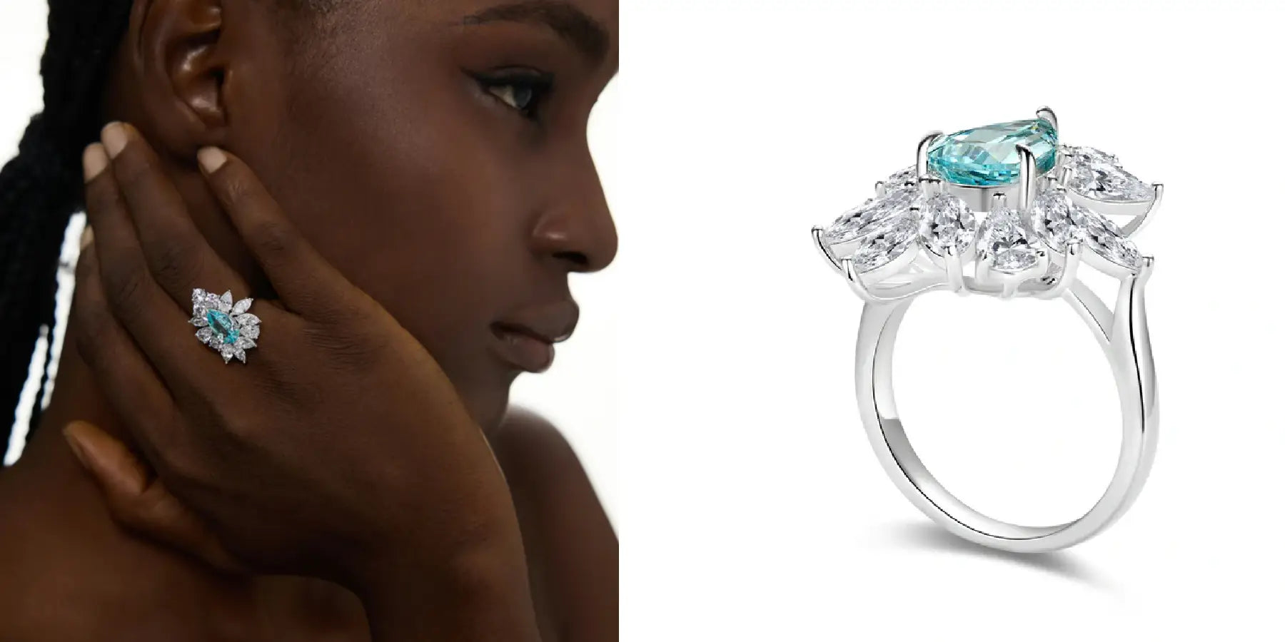 This exquisite ring features a captivating pear-cut teal gemstone at the center, surrounded by a dazzling arrangement of clear marquise and teardrop-cut stones. The unique floral-inspired design brings a touch of sophistication and glamour, making it perfect for special occasions or as a statement piece in your jewelry collection