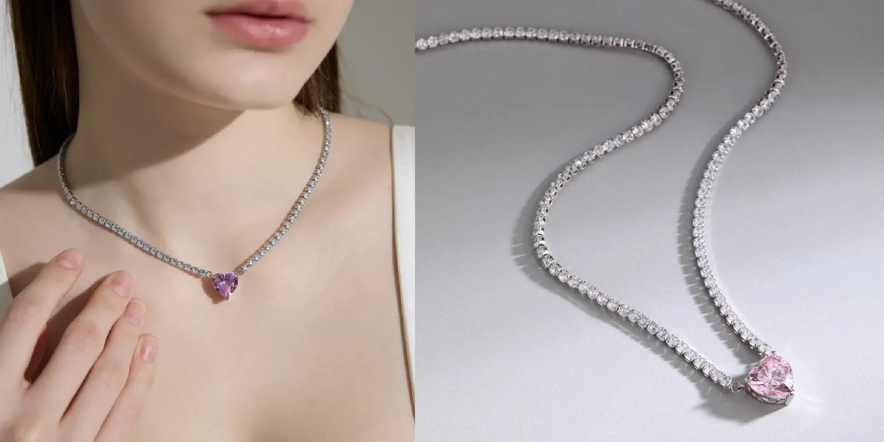 This elegant necklace features a dazzling heart-shaped pink gemstone as the centerpiece, radiating romance and sophistication. The chain is adorned with a continuous line of sparkling round-cut stones, creating a timeless tennis necklace design.