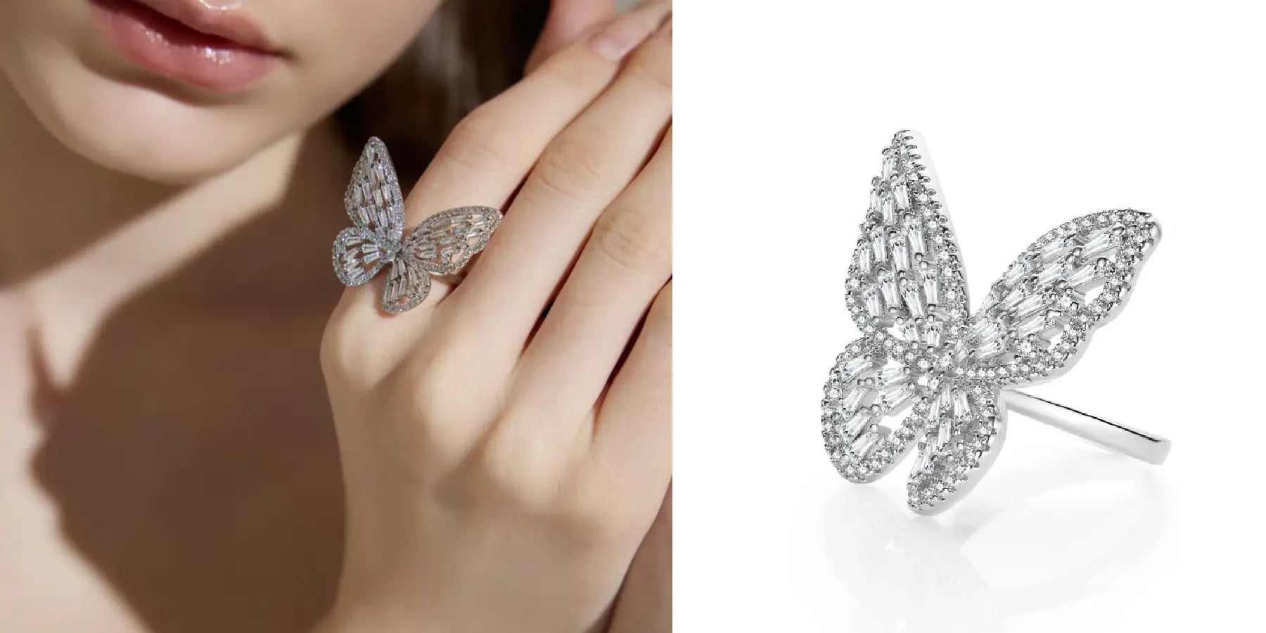 This exquisite butterfly ring features a dazzling design adorned with brilliant baguette-cut and round-cut crystals, creating a sparkling and luxurious effect. The delicate butterfly shape symbolizes beauty, transformation, and grace, making it a meaningful accessory for any jewelry collection.
