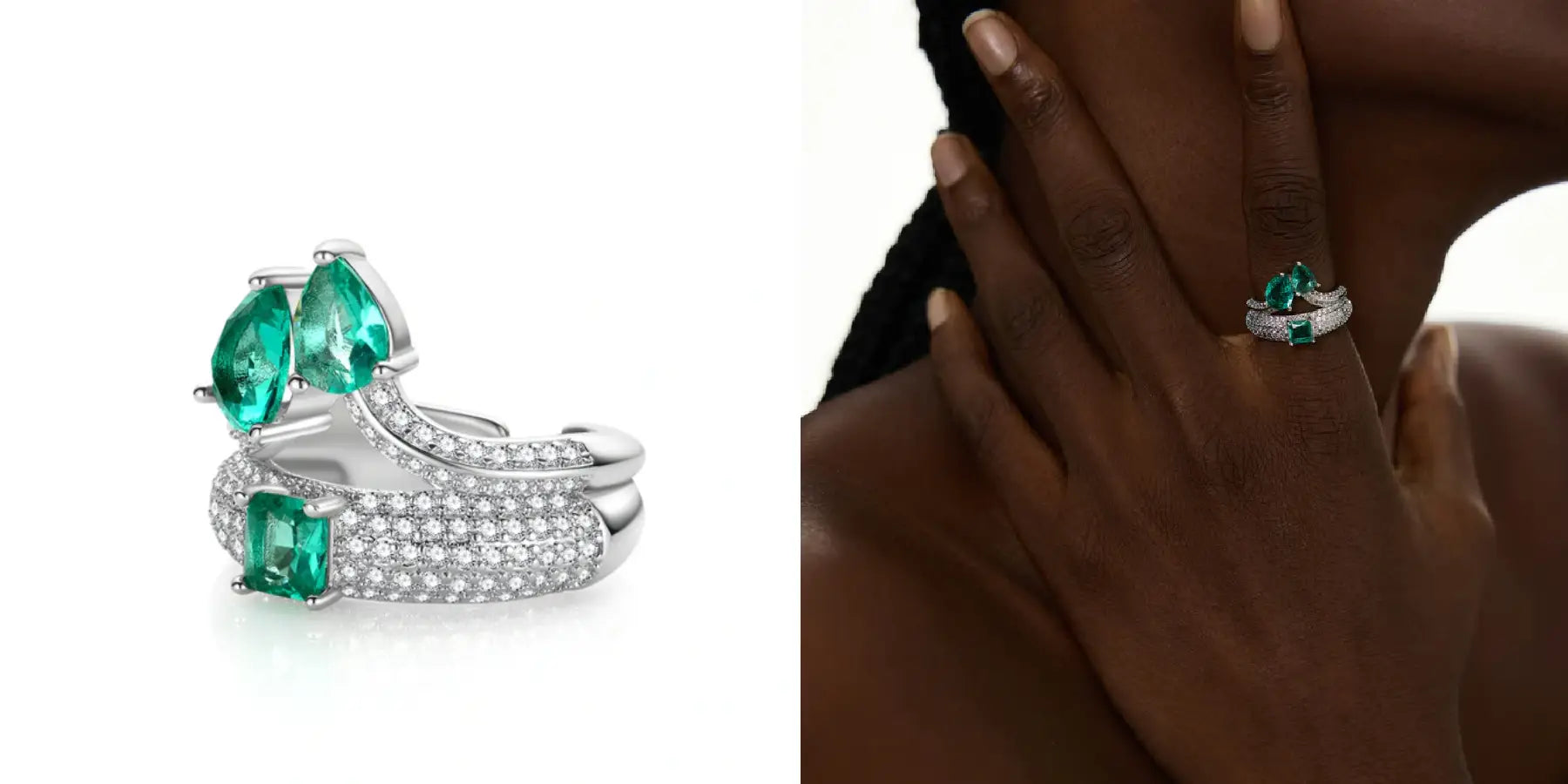 This exquisite ring showcases two stunning pear-cut emerald green gemstones and one square-cut centerpiece, symbolizing luxury and sophistication. The intricate split shank design is encrusted with sparkling round-cut stones, adding layers of brilliance and depth