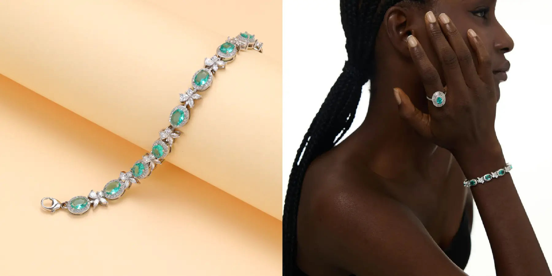 This stunning bracelet features oval-cut green gemstones paired with brilliant round-cut stones, creating a luxurious alternating link design. Each green gemstone is framed with delicate pavé-set stones, adding depth and sparkle