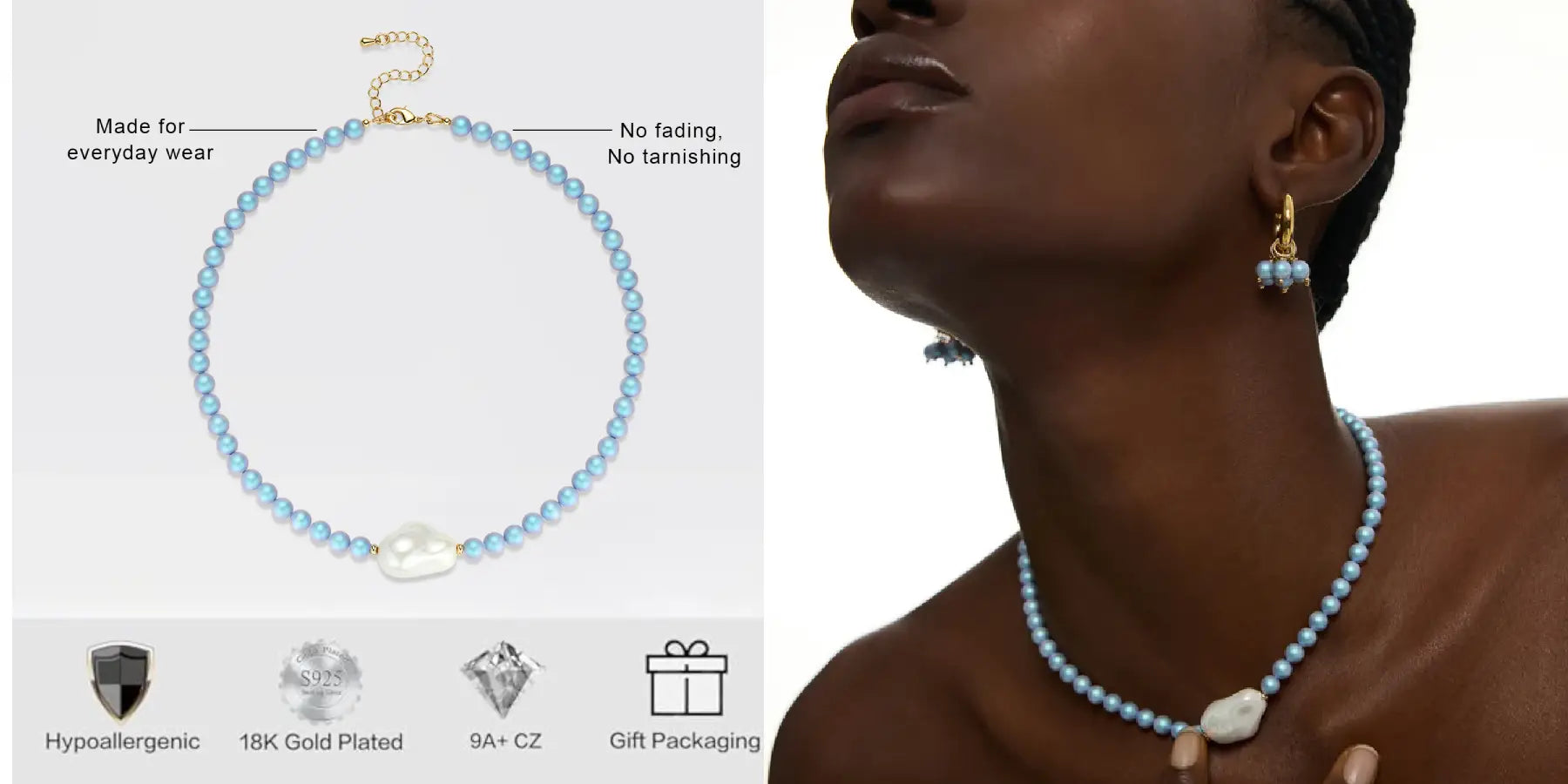 This delicate necklace features smooth, lustrous blue beads arranged in a classic strand design, highlighted by a unique white baroque-style pearl centerpiece. The gold-tone accents add a touch of sophistication, while the adjustable clasp ensures a comfortable and secure fit.