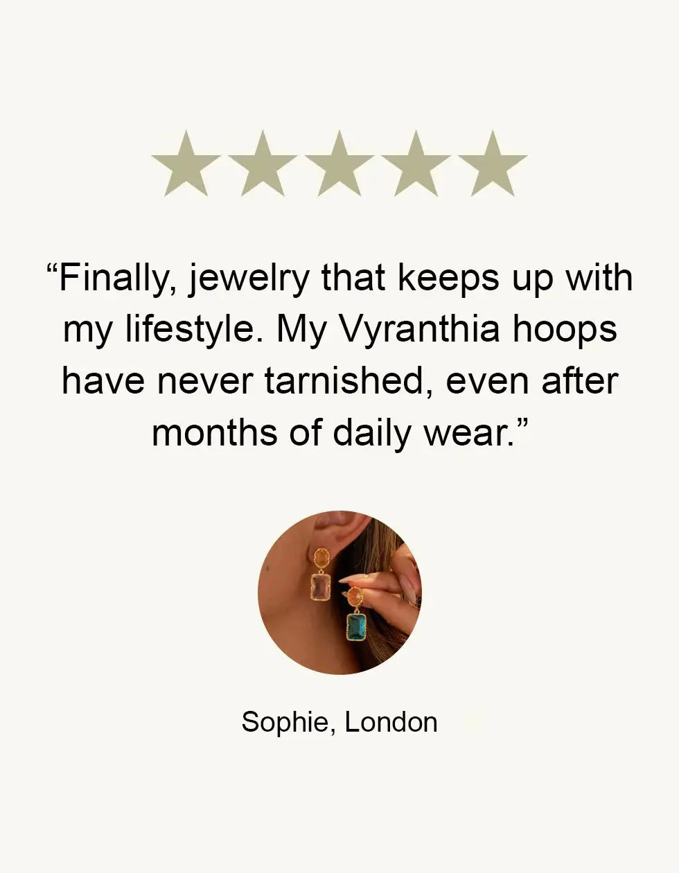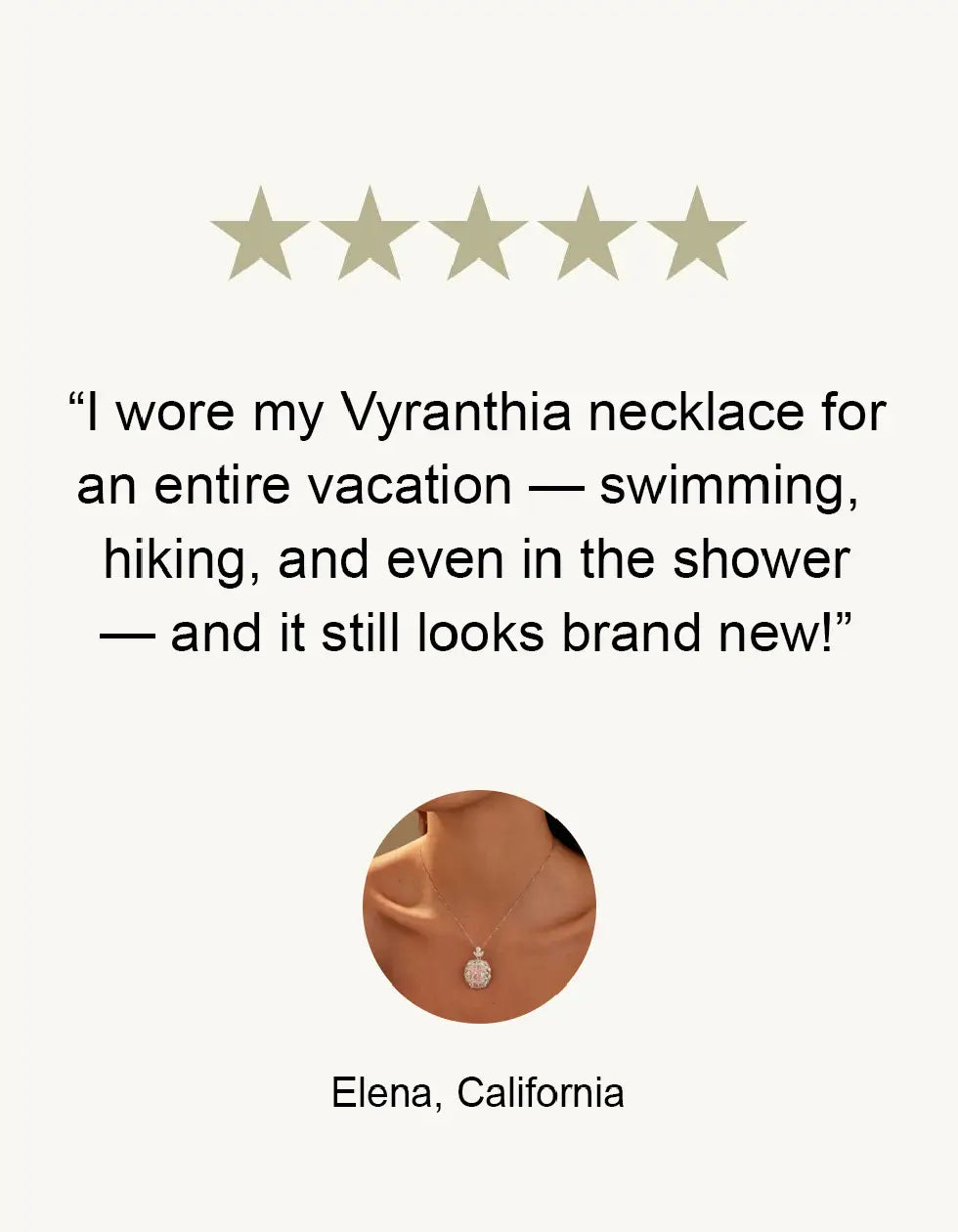 Each Vyranthia piece is waterproof, sweatproof, hypoallergenic, tarnish-free, and cosmetic-friendly.
